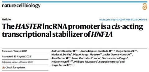 HNF1A homeobox A (HNF1A)编码同源域转录因子,其单倍体剂量不足突变会诱发糖尿病。本研究通过小鼠和人类模型实验,发现HNF1A的反义lncRNA启动子--HASTER可以顺式调节HNF1A的转录,并通过正负反馈回路维持HNF1A的细胞特异性生理浓度。HASTER突变的小鼠胰腺β细胞表现出HNF1A沉默或过表达,从而导致高血糖。该研究揭示了一种不同于经典增强子或沉默子的顺式调节元件,它能稳定靶基因的转录,并能保证细胞特异性转录因子程序的准确性。这一发现有助于开发新型糖尿病治疗策略,对我们理解疾病中的非编码基因组缺陷也具有普遍意义。