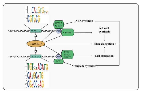 本研究中,作者联合DAP-seq、RNA-seq和GWAS的数据,筛选出与陆地棉纤维伸长相关的GhBES1.4靶基因,并构建了GhBES1.4调控纤维发育的转录调控网络。