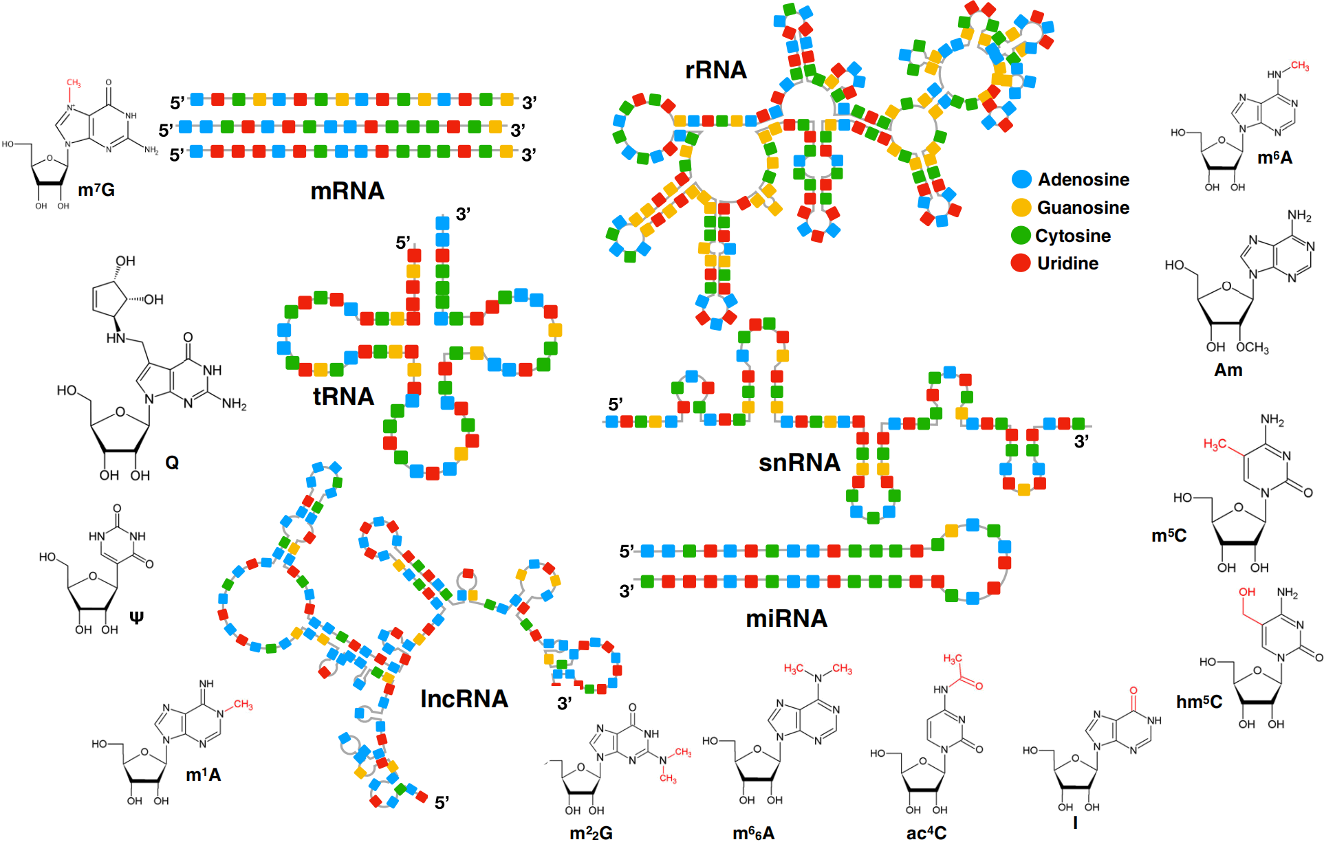 RNA修饰目前已经发现100多种,大部分发生在rRNA和tRNA上。近期研究发现多种修饰发生在mRNA和lncRNA上,全面参与RNA的结构、转运、稳定性和 mRNA 剪接等过程,是基因表达转录后调控的重要方式之一。